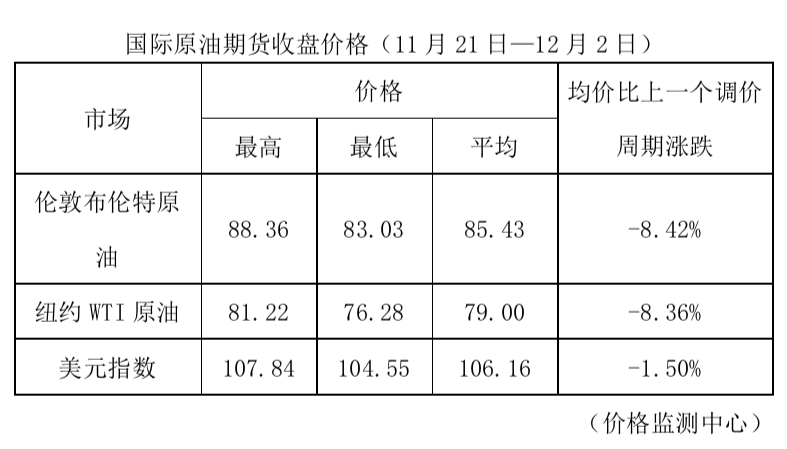 根據(jù)國(guó)家發(fā)改委消息,新一輪成品油調(diào)價(jià)窗口將于12月5日24時(shí)開啟。據(jù)國(guó)家發(fā)改委價(jià)格監(jiān)測(cè)中心監(jiān)測(cè),本輪成品油調(diào)價(jià)周期內(nèi)(11月21日—12月2日)國(guó)際油價(jià)大幅下降。平均來看,倫敦布倫特、紐約WTI油價(jià)比上輪調(diào)價(jià)周期下降8.39%。