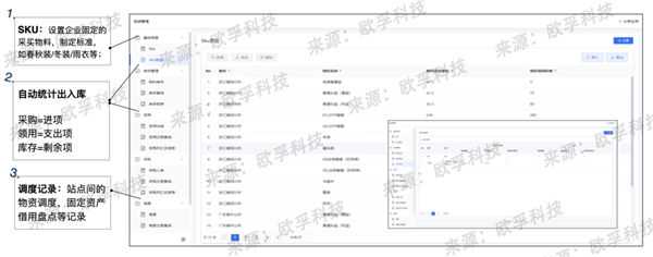 歐孚科技運用低代碼技術搭建了“物資進-出項“管理模塊。該模塊包括搭建SKU庫,對物資物料進行統(tǒng)一定義;配置采購調(diào)度的表單公式,使區(qū)域站點能根據(jù)實際領用情況進行填寫;根據(jù)各站點領用數(shù)據(jù),快速統(tǒng)計物料成本并進行庫存盤點管理。