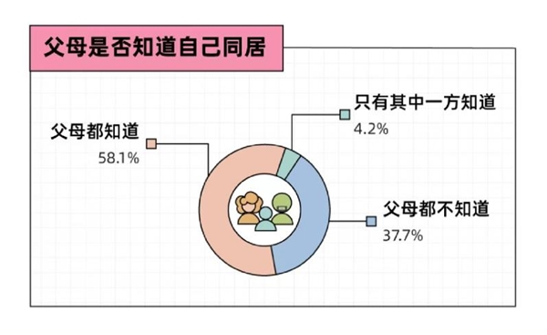 尤其值得注意的是,根據(jù)《報告》,37.7%的年輕人壓根就沒讓父母知道自己已經同居,還有4.2%的受訪者表示只讓父母中的一方知道情況。畢竟,父母對待同居的態(tài)度相對保守,尤其是女方,《報告》顯示僅有約三分之一的父母支持女生同居。