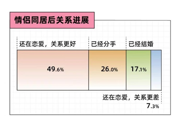 例如,此次的調查數(shù)據(jù)顯示,AA制正在成為年輕情侶分攤房租的主流方式。此外,從調查結果來看,超4成年輕人同居后的性生活達到1周2-3次。同居生活對情侶關系的改善超出了很多人的預期。