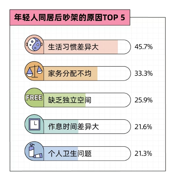同居吵架原因TOP5中,“家務分配不均”占比為33.3%,僅次于生活習慣差異大(45.7%)。