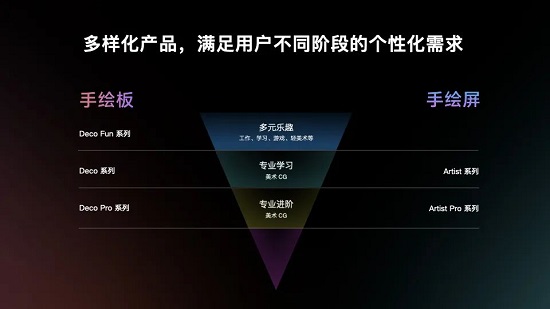 目前,XPPen 共有 2 大品類,5 大系列產品,包括數(shù)位板類的 Deco Fun、Deco、Deco Pro 系列及數(shù)位屏類 Artist、Artist Pro 系列產品。其中,Deco Fun 產品線系列面向多元樂趣用戶;Deco 和 Artist 產品線系列面向專業(yè)學習用戶;Deco Pro 和 Artist Pro 產品線系列面向專業(yè)進階用戶。全新的產品布局,可針對不同成長階段的用戶需求,打造從興趣入門到專業(yè)學習再到專業(yè)進階的產品矩陣。