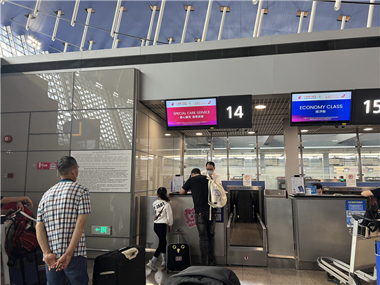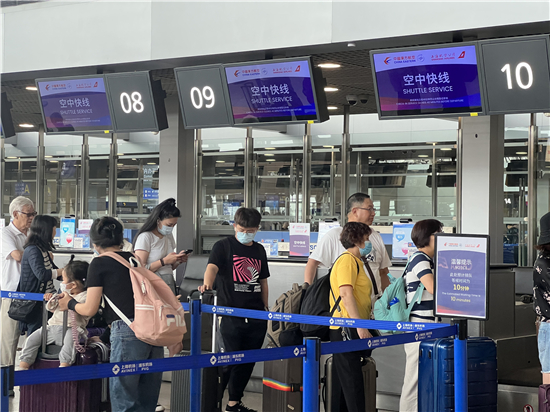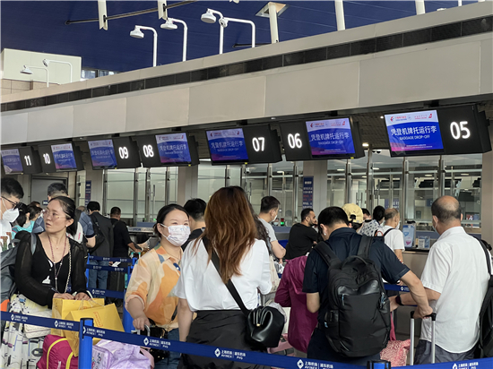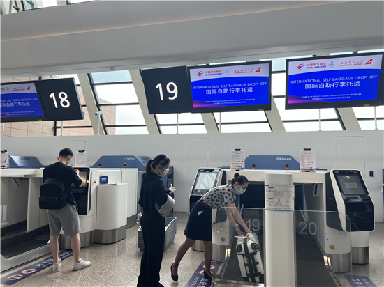 暑運期間客流上升,東航充分發(fā)揮上海虹橋、浦東兩場候機樓國內、國際值機區(qū)自助值機設備和自助行李托運設備作用,在客流高峰時段,對排長隊的旅客進行分流。