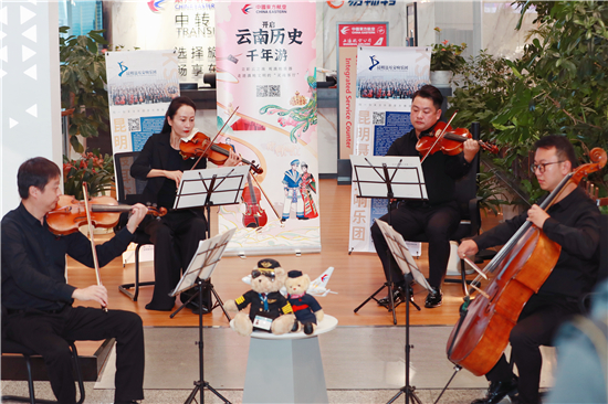 值得一提的是,中國唯一一支以人民音樂家“聶耳”命名的交響樂團——昆明聶耳交響樂團,在主題航班首航儀式活動現(xiàn)場,用專業(yè)、優(yōu)雅的演奏,帶領旅客走進云南,靈動的音符、悅耳的曲調(diào)贏得了旅客的稱贊與掌聲。