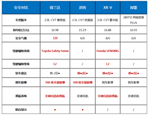 而在主動安全配置上,四款車型中僅有2款提供了選擇,分別為鋒蘭達(dá)搭載的T-PILOT智能駕駛輔助,以及XR-V的Honda SENSING駕駛輔助系統(tǒng),兩車的功能性方面均滿足L2級的自動駕駛。并且兩車的主動安全都近乎實(shí)現(xiàn)全系標(biāo)配,這也讓購車的消費(fèi)者不用過多在主動安全以及更高的預(yù)算上左右為難。