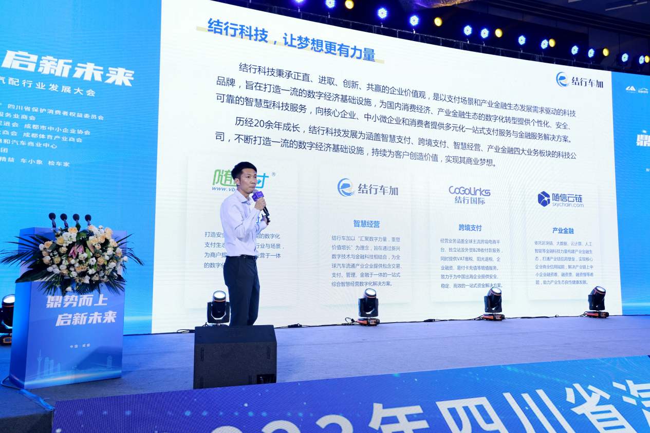 2023年6月11日,由四川省汽車汽配服務(wù)業(yè)商會(huì)主辦、豆秒好車集團(tuán)承辦的“2023年四川省汽車汽配行業(yè)發(fā)展大會(huì)”在成都隆重舉行,本次峰會(huì)以“鼎勢(shì)而上·啟新未來”為主題,廣邀800+車商和四川及全國汽車行業(yè)商協(xié)會(huì)、政府主管部門等相聚蓉城,共商行業(yè)的變革與機(jī)遇。結(jié)行科技旗下汽車資產(chǎn)數(shù)字化服務(wù)平臺(tái)結(jié)行車加也受邀參會(huì),副總經(jīng)理史云峰先生在會(huì)上做了精彩分享。