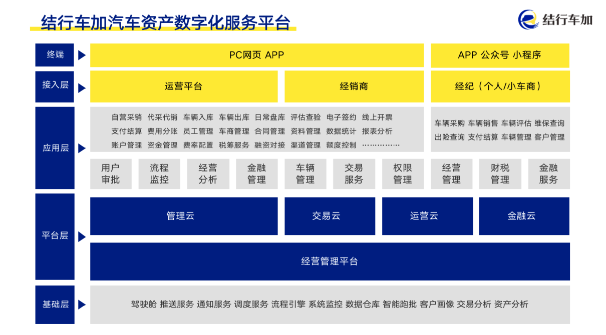 結(jié)行車加汽車資產(chǎn)數(shù)字化服務(wù)平臺(tái)包含數(shù)智管理、數(shù)智運(yùn)營、數(shù)智服務(wù)、數(shù)智金融四大功能,能為客戶提供聯(lián)合采購、財(cái)稅管理、報(bào)表管理、金融服務(wù)、風(fēng)控審批以及車輛評(píng)估、維保查詢、線上開票等實(shí)用增值服務(wù),可為二手車交易從業(yè)者搭建標(biāo)準(zhǔn)化、線上化、數(shù)字化、智能化基礎(chǔ)設(shè)施,快速提升車企經(jīng)營水平,實(shí)現(xiàn)降本增效、優(yōu)化資源配置。