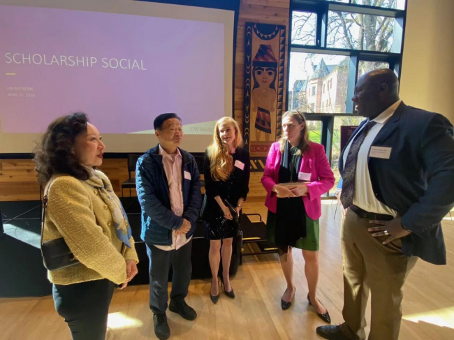 (來(lái)輝武教授(左二)參加華大醫(yī)學(xué)院獎(jiǎng)學(xué)金捐贈(zèng)人答謝酒會(huì),左一為華大醫(yī)學(xué)國(guó)際發(fā)展部部長(zhǎng)李縈博士,左三為華大醫(yī)學(xué)院副院長(zhǎng)Maggie Keelan,右一為華大醫(yī)學(xué)院副院長(zhǎng)Gerald Tolbert博士)