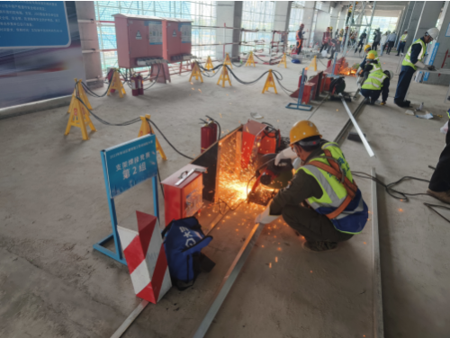 隨著一聲哨響,比賽正式開(kāi)始,四個(gè)比賽項(xiàng)目的參賽隊(duì)員迅速行動(dòng)、各亮絕活,在同等條件下進(jìn)行工效、工藝、操作規(guī)程等多方面比拼。在砌筑比賽中,選手根據(jù)規(guī)則,通過(guò)識(shí)圖、排版放樣、測(cè)量、勾縫、清潔等步驟,完成最終作品,整個(gè)過(guò)程一氣呵成;在支架焊接比賽中,“悍將們”一手拿防護(hù)面罩,一手持電焊槍,仔細(xì)打磨、配對(duì)、焊接,完成比賽項(xiàng)目;在支撐架搭設(shè)比賽中,選手們安全帽、防滑鞋佩戴整齊,安全帶系掛牢靠,嚴(yán)格遵守安全規(guī)范要求,每一個(gè)步驟都安全有序……整個(gè)比賽現(xiàn)場(chǎng)一片忙而不亂的景象,再現(xiàn)了建筑工地日常忙碌的施工場(chǎng)景。