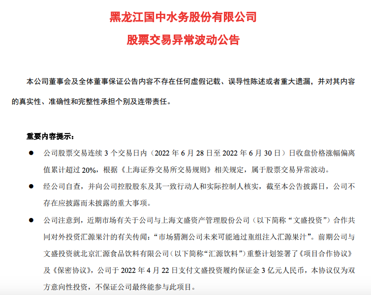 6月30日晚間,國(guó)中水務(wù)發(fā)布《股票交易異常波動(dòng)公告》稱,公司注意到,近期市場(chǎng)有關(guān)于公司與文盛投資合作共同對(duì)外投資匯源果汁的有關(guān)傳聞:“市場(chǎng)猜測(cè)公司未來(lái)可能通過(guò)重組注入?yún)R源果汁”。經(jīng)公司核查如下:前期公司與文盛投資就匯源飲料重整計(jì)劃簽署了《項(xiàng)目合作協(xié)議》及《保密協(xié)議》,公司于2022年4月22日支付文盛投資履約保證金3億元,本協(xié)議僅為雙方意向性投資,不保證公司最終能參與此項(xiàng)目。