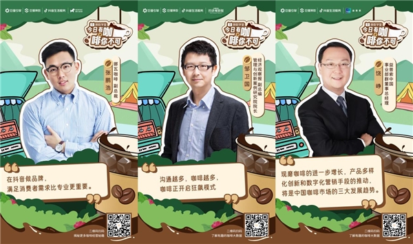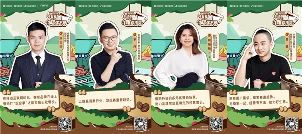 為此《算數(shù)學(xué)堂》重磅推出《今日有咖·啡你不可》欄目,聚焦咖啡賽道,為品牌商家們指點迷津,并邀請了8位重磅嘉賓,專業(yè)覆蓋咖啡生態(tài)各個環(huán)節(jié),包括消費(fèi)行業(yè)專家2位、咖啡品牌商家代表2家、品牌代理服務(wù)商1家、抖音生活服務(wù)專家2位、巨量引擎商業(yè)分析1位,他們將分別從各自的領(lǐng)域出發(fā),分享有關(guān)咖啡行業(yè)未來趨勢、品牌經(jīng)營方法論、抖音平臺數(shù)字化營銷秘籍等真知灼見。