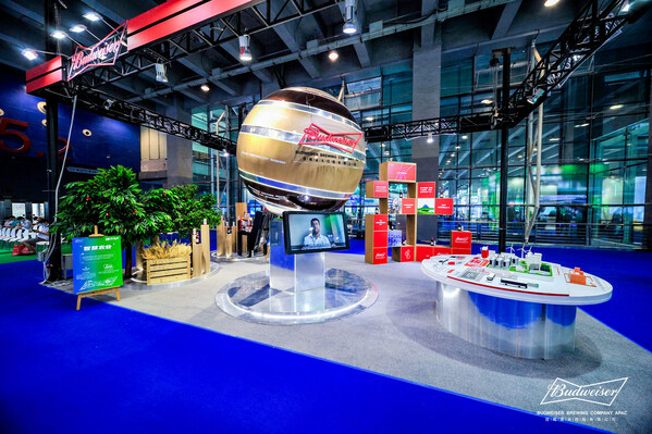百威作為可持續(xù)發(fā)展的先行者,本次展臺遵循綠色低碳的設(shè)計理念,采用更具可持續(xù)性的材料分展區(qū)展示百威在ESG策略、綠色生產(chǎn)和綠色物流、水資源管理、智慧農(nóng)業(yè)、循環(huán)包裝等方面的豐碩成果。其中地球形狀的循環(huán)裝置采用了由百威啤酒糟回收制作而成的植物基皮革、環(huán)保紙等可回收再生的包裝材料,整體布局風(fēng)格充分體現(xiàn)了"綠動未來"的參展主題特色。一直以來,百威將可持續(xù)發(fā)展理念貫穿業(yè)務(wù)始終,憑借極具前瞻性的戰(zhàn)略目標,配合強大的本土執(zhí)行能力,在本屆盛會交出了一份亮眼的綠色發(fā)展"成績單",吸引眾多嘉賓觀眾駐足參觀交流。