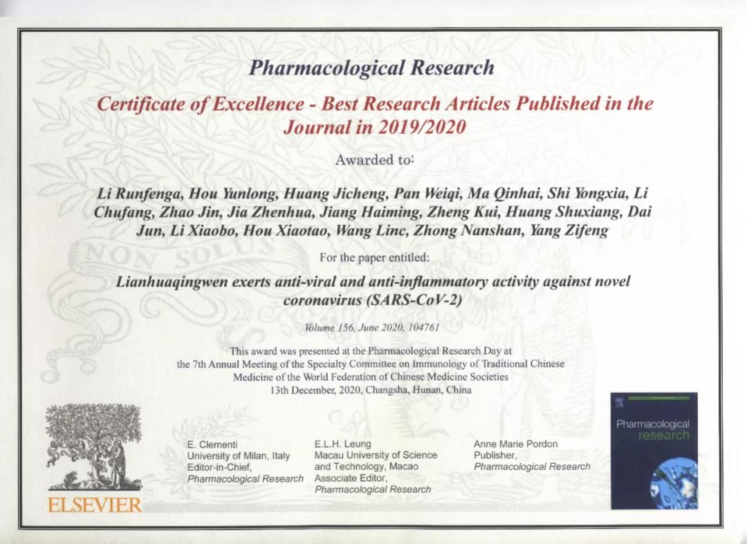 論文《連花清瘟對(duì)新型冠狀病毒具有抗病毒、抗炎作用》被國(guó)際期刊《藥理學(xué)研究》評(píng)選為2019-2020年度全球優(yōu)秀論文獎(jiǎng)