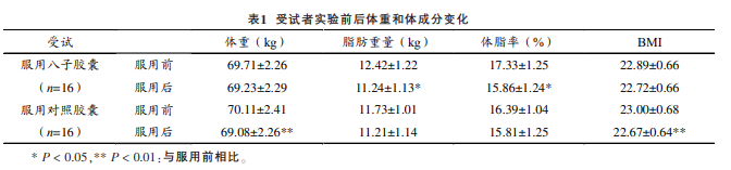 國家體育總局運(yùn)動(dòng)醫(yī)學(xué)研究所的一項(xiàng)針對男子足球運(yùn)動(dòng)員賽前準(zhǔn)備期和比賽期血液生化指標(biāo)和運(yùn)動(dòng)能力的研究表明,服用八子補(bǔ)腎膠囊受試者實(shí)驗(yàn)后,脂肪重量和體脂率較實(shí)驗(yàn)前明顯降低[3](見表1)。