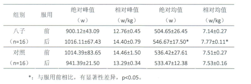 在減少脂肪含量的同時(shí),還要注意增加肌肉量。這里要關(guān)注一個(gè)指標(biāo),無氧運(yùn)動(dòng)能力。無氧運(yùn)動(dòng)能力是人體基本運(yùn)動(dòng)能力之一,主要反映機(jī)體骨骼肌在不同運(yùn)動(dòng)階段短時(shí)快速激烈運(yùn)動(dòng)的一種運(yùn)動(dòng)能力。來自國家運(yùn)動(dòng)營養(yǎng)測試研究中心的一項(xiàng)實(shí)驗(yàn)報(bào)告表明,服用“八子補(bǔ)腎膠囊”后運(yùn)動(dòng)員的無氧功率平均值和相對無氧功率平均值明顯升高,說明“八子補(bǔ)腎膠囊”可以提高無氧運(yùn)動(dòng)能力[6](見表2)。