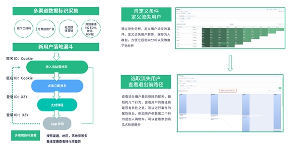 第二,接得住,即流量承接方式的優(yōu)化效率。投放物料效果的好壞,會直接影響轉(zhuǎn)化率和獲客成本,最合理的評估方式是通過 A/B 測試,快速迭代和優(yōu)化落地頁。另外,神策數(shù)據(jù)職業(yè)教育 & 素質(zhì)教育解決方案能夠?qū)崿F(xiàn)新用戶從站外到站內(nèi)行為路徑貫通,有效定位線索流失原因,進而調(diào)整承接策略。