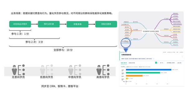 當學(xué)員與課程產(chǎn)品交互越多,用戶畫像就會越豐富,班主任對學(xué)員的復(fù)購、進階意向也就掌握得更精準,通過量化學(xué)員關(guān)鍵行為,及時跟進高意向?qū)W員,并對不同群體采取差異化銷售策略,以此提高學(xué)員復(fù)購率。