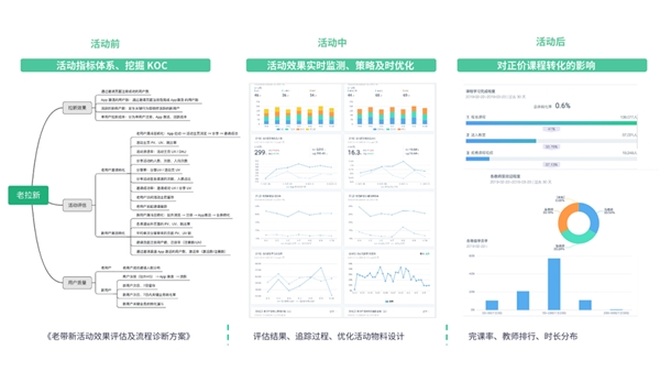 活動后:分析活動對用戶活躍層級、消費層級的整體影響,選出活動最受歡迎的課程和老師,迭代下一輪活動策略。