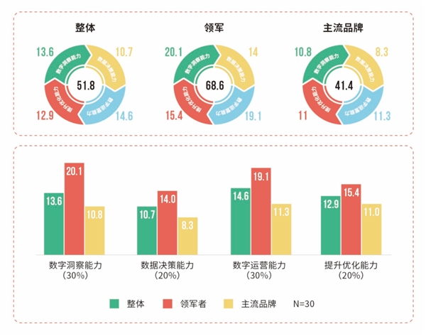 根據(jù)神策數(shù)據(jù)對新國貨美妝品牌數(shù)字化運營成熟度評估的指標(biāo)解讀發(fā)現(xiàn):國貨美妝整體數(shù)字化營銷能力處于中游水平,各領(lǐng)域均有較大提升空間;領(lǐng)軍者在模型各方面均較領(lǐng)先,其中【數(shù)字洞察能力】和【數(shù)字運營能力】是關(guān)鍵;主流品牌的數(shù)字化營銷能力還偏弱,主要體現(xiàn)在【數(shù)字洞察能力】上的建設(shè)力度不夠。