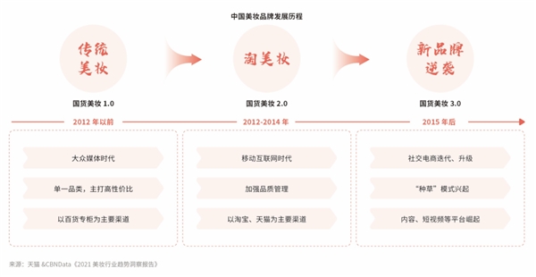 伴隨著大眾媒體、移動互聯(lián)網(wǎng)、社交電商的發(fā)展與升級,中國美妝品牌經(jīng)歷了“傳統(tǒng)美妝→淘美妝→新品牌逆襲”的過程。目前,國貨美妝已經(jīng)迎來 3.0 時期,依托社交電商占領(lǐng)消費者心智。