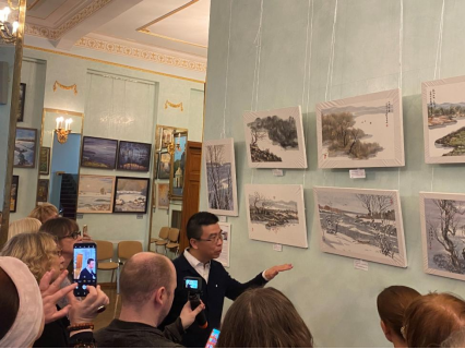 開幕當(dāng)天,畫家劉子輿受邀走進俄羅斯國家科學(xué)院“大師課堂”,教授俄羅斯學(xué)員創(chuàng)作中國水墨畫。學(xué)員不少是俄羅斯知名的專業(yè)油畫家。劉子輿從畫面構(gòu)圖、運筆、調(diào)墨、調(diào)色等方面進行深入講解,現(xiàn)場示范中國繪畫技巧,墨色在宣紙上產(chǎn)生濃淡變化,學(xué)員們很驚喜,非常感謝劉子輿帶領(lǐng)他們體驗了東方藝術(shù)之美。