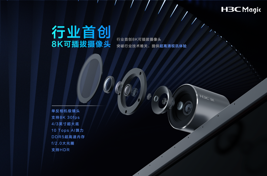 值得關(guān)注的是,行業(yè)首創(chuàng)的8K可插拔攝像頭,采用遠超傳統(tǒng)會議一體機和手機芯片的4/3英寸超大尺寸感光傳感器,搭配無畸變非球面玻璃鏡頭與f/2.0大光圈,配備10Tops AI算力和DDR5超高速的內(nèi)存,并且能夠支持8K 30fps與HDR功能,敏銳捕捉光源信息變化的同時快速反饋完成視覺成像,保證了超高清的視訊體驗,靈動捕捉每一幀超真感視效。同時,攝像頭能夠支持即插即用功能,為高敏感行業(yè)的隱私訴求提供了更好地選擇,最大限度保障用戶信息安全。