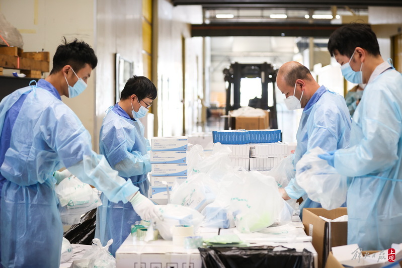 現(xiàn)場(chǎng)負(fù)責(zé)人楊東告訴記者:“我們是4月6日晚上接收到分裝任務(wù),目前累計(jì)打包送出8萬(wàn)余份‘防疫服務(wù)包’,我們從早到晚能快一點(diǎn)就快一點(diǎn),就想著盡快把物資打包好送到居民手中。”