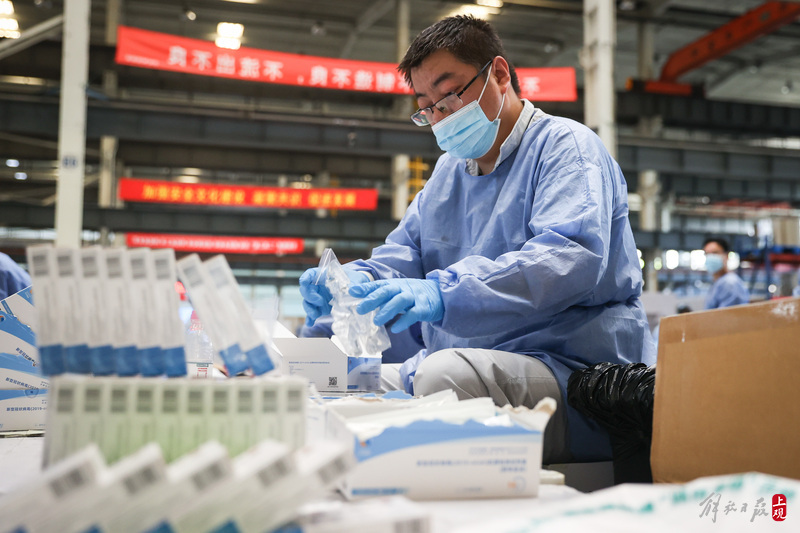 2022年4月11日,上觀新聞?dòng)浾邅?lái)到業(yè)績(jī)路上的寶山防疫服務(wù)包最大的分裝車間,這里原本是上海漢虹精密機(jī)械有限公司的生產(chǎn)廠房,但該廠百余名志愿者從早上八點(diǎn)就開始分批次投入到了防疫物資的分裝“流水線”作業(yè)中,一張張清單核對(duì),一件件物資分裝,現(xiàn)場(chǎng)熱火朝天。