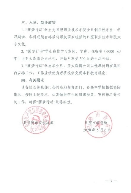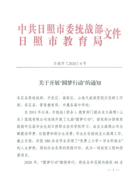 2011年,亞太森博與統(tǒng)戰(zhàn)部門合作開展的“圓夢行動”正式啟動。亞太森博出資,統(tǒng)戰(zhàn)協(xié)調(diào)教育部門出政策,與大學(xué)合作,為考上大學(xué)的家庭貧困高中生解決學(xué)費、生活費,圓夢大學(xué)。
