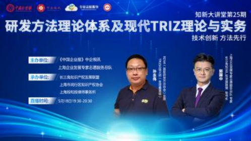 5月18日,中企視訊《知新大講堂》第25期節(jié)目線上開播。RDMI(國際研發(fā)方法協(xié)會)主席、TRIZ五級大師(全球最高級)、DFSS(六西格瑪設(shè)計(jì))黑帶大師孫永偉博士做客中企視訊直播間,長三角知識產(chǎn)權(quán)發(fā)展聯(lián)盟秘書長郭國中擔(dān)任主持人,介紹了現(xiàn)代TRIZ理論體系的組成以及它在技術(shù)創(chuàng)新、新產(chǎn)品研發(fā)、專利布局、規(guī)避、挖掘等專利戰(zhàn)略、運(yùn)用創(chuàng)新大幅降本等方面的重要作用。