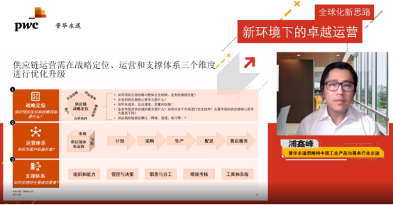 浦鑫峰表示,供應(yīng)鏈正成為企業(yè)實(shí)現(xiàn)全球增長的重要手段之一,呈現(xiàn)全球化、定制化、智能化等發(fā)展趨勢。聚焦國內(nèi)眾多出海企業(yè),現(xiàn)有供應(yīng)鏈體系多面臨短期無法充分滿足海外市場需求、中長期無法更好支撐海外業(yè)務(wù)發(fā)展以及全球化對供應(yīng)鏈運(yùn)營提出的更高要求等挑戰(zhàn)。普華永道結(jié)合成功項(xiàng)目經(jīng)驗(yàn)及行業(yè)洞察,幫助企業(yè)通過對供應(yīng)鏈戰(zhàn)略定位、運(yùn)營體系和支撐體系三個維度的優(yōu)化升級,打造端到端卓越供應(yīng)鏈運(yùn)營能力,提升運(yùn)營效率、實(shí)現(xiàn)規(guī)模經(jīng)濟(jì)效益、并優(yōu)化對海外業(yè)務(wù)的管理和管控,進(jìn)一步推動全球化業(yè)務(wù)發(fā)展。