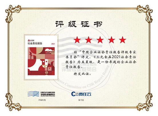 近年來(lái),三元食品始終保持與利益相關(guān)方充分交流與溝通。2022年,三元食品發(fā)布的第8份年度社會(huì)責(zé)任報(bào)告,并連續(xù)四年獲評(píng)中國(guó)企業(yè)社會(huì)責(zé)任報(bào)告評(píng)級(jí)專(zhuān)家委員會(huì)"五星級(jí)"評(píng)價(jià)。評(píng)級(jí)專(zhuān)家委員會(huì)評(píng)價(jià),《北京三元食品股份有限公司2021社會(huì)責(zé)任報(bào)告》是一份卓越的企業(yè)社會(huì)責(zé)任報(bào)告。