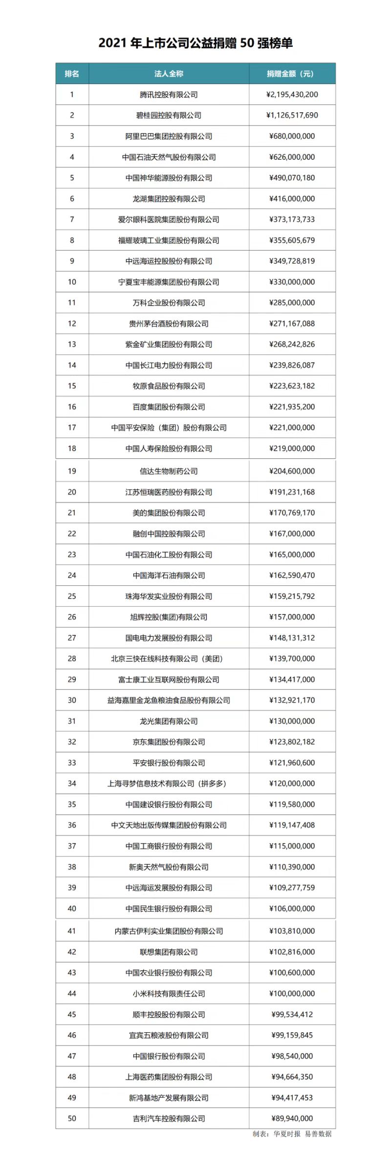 《報(bào)告》公布了2021年上市公司公益捐贈50強(qiáng)榜單。
