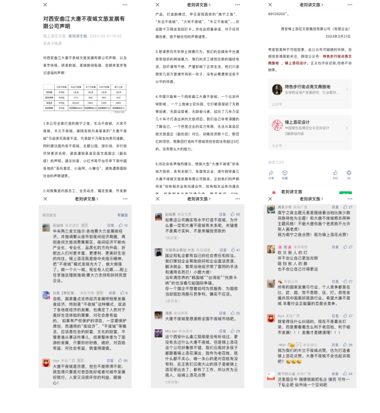 2023年3月16日,大唐不夜城官方率先在抖音、曲江文旅、大唐不夜城、曲江文化、微博、西安大唐不夜城等平臺(tái)官方認(rèn)證賬號(hào)上全網(wǎng)發(fā)布聲明,該聲明指出:發(fā)現(xiàn)網(wǎng)絡(luò)流傳的“西安“錦上添花”就是西安大唐不夜城的打造者”及“該集團(tuán)董事長(zhǎng)劉磊為大唐不夜城項(xiàng)目策劃師”等不實(shí)消息,是假冒大唐不夜城品牌“該集團(tuán)及其相關(guān)人員打著該旗號(hào)欲與多家單位達(dá)成合作,該集團(tuán)及其相關(guān)人員虛假宣傳行為給我司已造成嚴(yán)重不良的社會(huì)影響?!?/p>