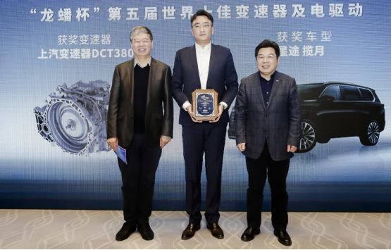 汽車評(píng)價(jià)研究院院長李慶文(左1)與中國汽車工業(yè)協(xié)會(huì)副秘書長羅軍民(右1)為上汽變速器市場(chǎng)營銷負(fù)責(zé)人王含東(中)頒獎(jiǎng)