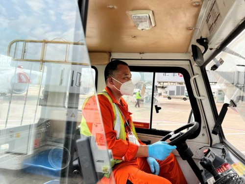 MU6328航班到達(dá)行李運(yùn)送中,開窗通風(fēng)才能讓小小的行李牽引車車內(nèi)溫度降低點。