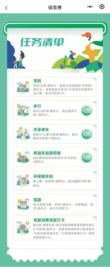 “出行碳索賽”作為亮點(diǎn)活動(dòng)之一,更是讓人眼前一亮。10日25日起,通過微信進(jìn)入“碳惠天府”小程序,踐行包括每日步行、騎共享單車、自愿停駛?cè)加蛙?、環(huán)保隨手拍、低碳消費(fèi)場景打卡等多種綠色低碳任務(wù),均能獲得相應(yīng)的碳積分。
