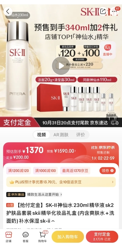 享譽(yù)全球的SK-II鎮(zhèn)店王牌神仙水,是每個(gè)精致女孩化妝臺(tái)上的必備好物。其蘊(yùn)含超過90%的天然生物成分PITERA?,從根源強(qiáng)韌修護(hù),顯著減少秋冬肌膚干燥泛紅,抑制老化因子,讓肌膚更加細(xì)膩緊致、晶瑩剔透。京東11.11期間,原價(jià)1590元的SK-II神仙水230ml裝到手價(jià)1370元,同時(shí)加贈(zèng)神仙水110ml、潔面20g、清瑩露30ml,為消費(fèi)者打造全流程的精致護(hù)膚體驗(yàn)。