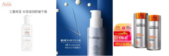 雅漾三重修護(hù)盈潤乳、露得清維A醇抗皺修護(hù)晚霜、歐萊雅勁能醒膚露