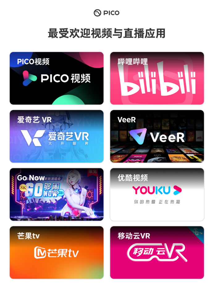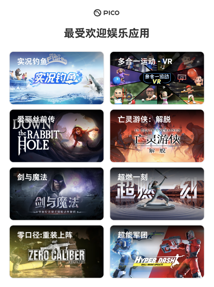 作為頭部XR品牌,PICO始終致力于幫助VR開啟大眾化之路,而豐富且優(yōu)質的內容和應用生態(tài),是吸引大眾消費者購買VR、使用VR的關鍵。近兩年全球VR技術日漸成熟,產品快速迭代,PICO作為國內最完善的VR內容平臺,亦在持續(xù)完善內容生態(tài),積極加速與第三方的合作腳步,并在自制內容方面大力投入,致力打造國內應用最豐富、最優(yōu)質的VR內容平臺。迄今為止PICO應用商店已擁有超過200款國內外優(yōu)質的VR應用。