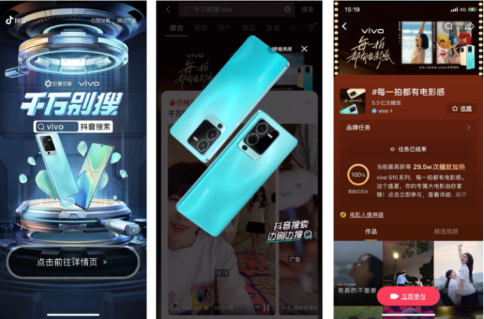 例如,在「千萬別搜」第一季中,vivo便通過兼具時尚感與科技感的創(chuàng)意開屏激發(fā)用戶點(diǎn)擊興趣,讓用戶通過點(diǎn)擊一鍵直達(dá)熱點(diǎn)品專并彈出彩蛋承接用戶興趣,進(jìn)一步聯(lián)動#每一拍都有電影感話題轉(zhuǎn)化經(jīng)營——通過這條完整的路徑,vivo實現(xiàn)話題頁5.3億曝光、全民任務(wù)播放量超穩(wěn)定播放區(qū)間最高值1.8倍的超預(yù)期佳績。