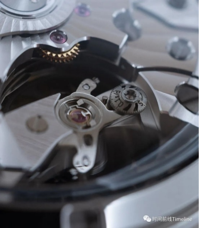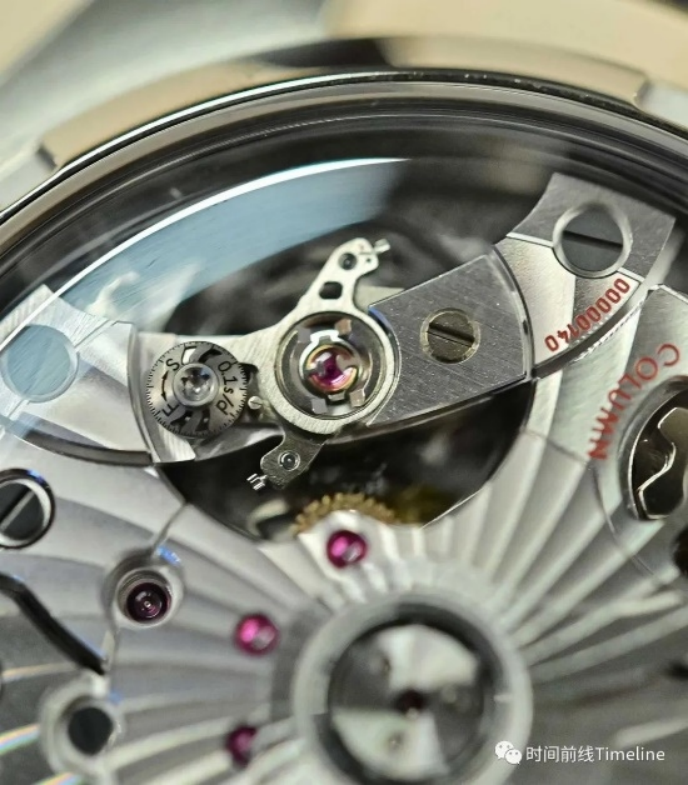 使用柱狀輪,垂直離合,硅游絲,無(wú)卡度砝碼微調(diào),擺頻28800次/時(shí),動(dòng)力60小時(shí)。但各位可以看到,擺輪夾板上,多了Spirate系統(tǒng)的調(diào)節(jié)“小圓片”。