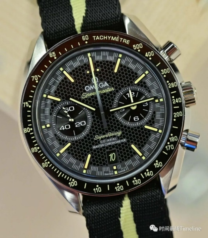 超霸Super Racing的盤面布局,是雙眼計(jì)時(shí)盤,3點(diǎn)位是60分鐘和12小時(shí)計(jì)時(shí)盤 (兩根計(jì)時(shí)指針是同軸的),9點(diǎn)位是小秒針。但凡是歐米茄9系計(jì)時(shí)機(jī)芯,都是這種布局。手表盤面上呈現(xiàn)“蜂巢”結(jié)構(gòu)。
