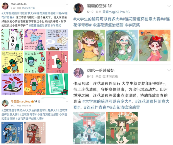 時(shí)代在發(fā)展,青年在進(jìn)步,創(chuàng)作新勢(shì)力隨著青年一代的熱血成長也在持續(xù)擴(kuò)大聲量,此次征集到的創(chuàng)意作品高燃展現(xiàn)了Z世代的創(chuàng)意腦洞,賦能連花清瘟無限青春力量。