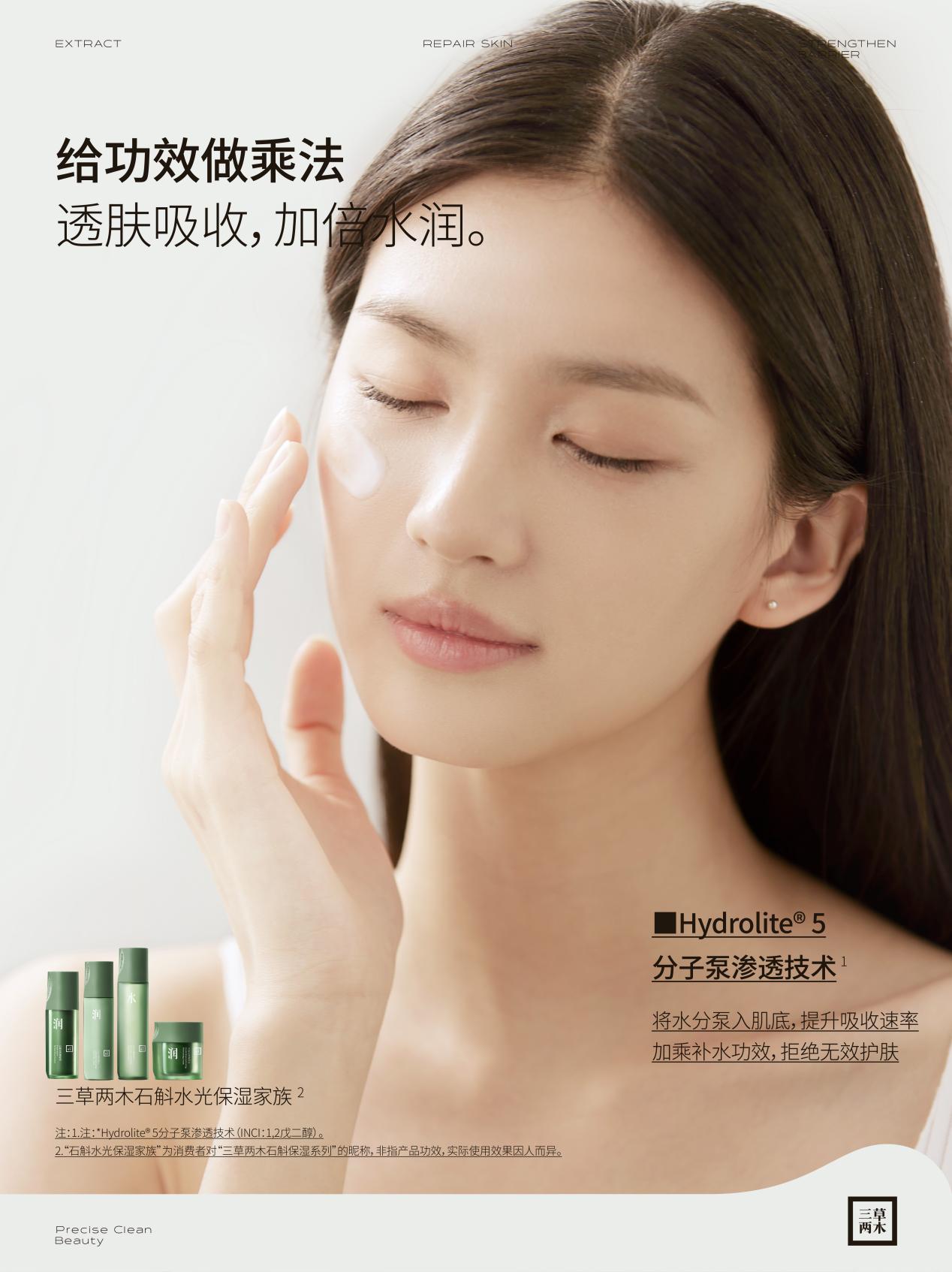 此外,三草兩木石斛系列還創(chuàng)造性地使用了Hydrolite? 5分子泵滲透技術(shù),在肌膚皮層中建立一座“輸水分子泵”,使得功效成分穿過(guò)肌膚皮層,直接泵入真皮層,大大地提升了功效成分的生物利用度,將水分切實(shí)輸送至肌底,擺脫外層濕潤(rùn)、內(nèi)層干燥的“假潤(rùn)”困局,幫助肌膚實(shí)現(xiàn)由內(nèi)而外的瑩潤(rùn)水亮。