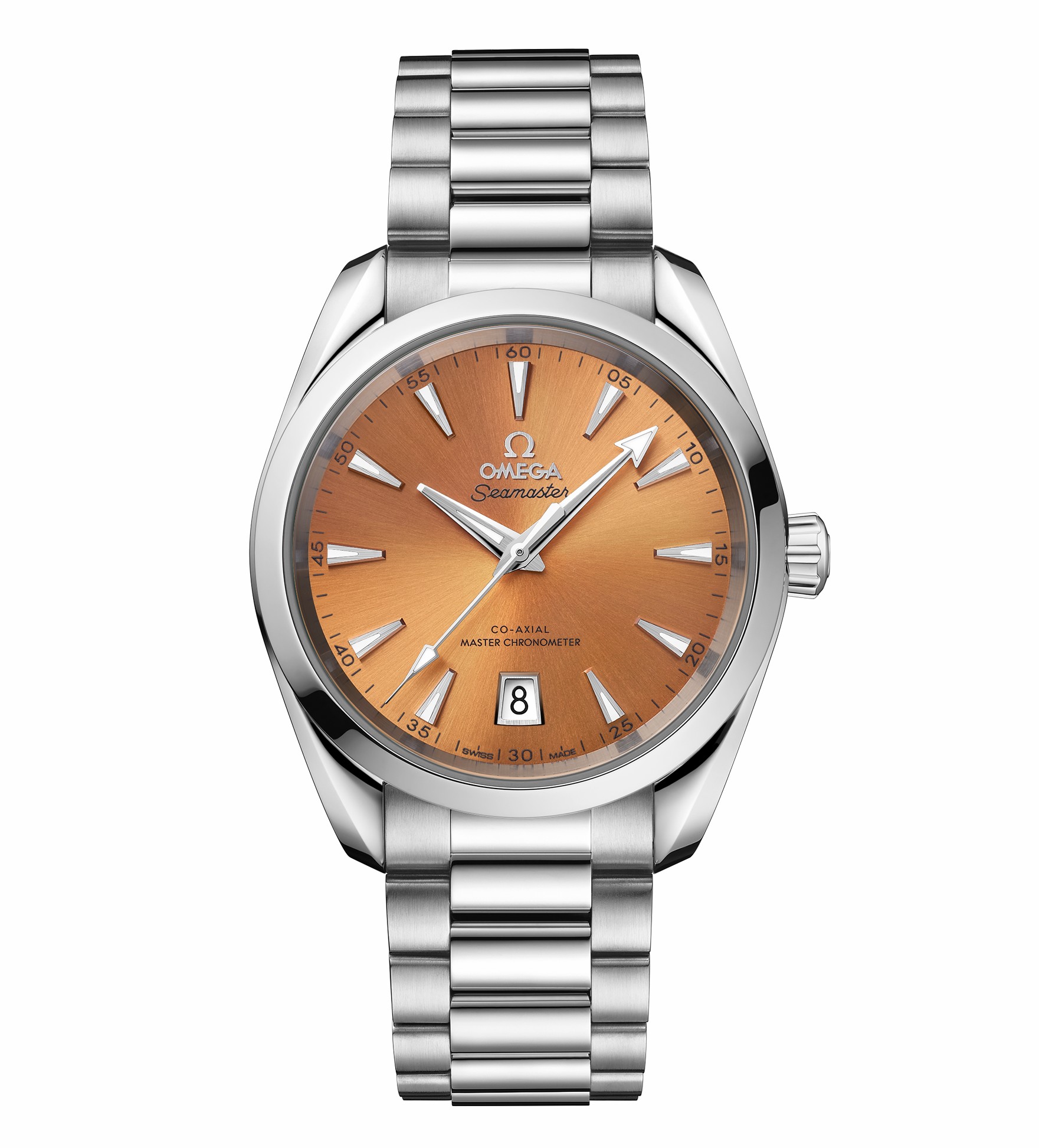 海馬系列 Aqua Terra 150米38毫米至臻天文臺表采用對稱設計,表殼和表冠均以拋光精鋼材質打造,表背采用波紋邊緣設計。6點位設有日歷窗,鍍銠指針和小時刻度均覆有白色 Super-LumiNova 夜光涂層。不銹鋼表鏈采用精美的圓弧形鏈節(jié),經(jīng)拋光和拉絲處理。內部搭載歐米茄8800至臻天文臺機芯,通過由瑞士聯(lián)邦計量研究院(METAS)核準的至臻天文臺認證,其精準度、防磁性和整體性能均達到行業(yè)的更高標準。其表盤由黃銅制成,經(jīng)過漆面處理,由中央向四周呈現(xiàn)出太陽射線的打磨效果。各種色彩中,橘黃色古典氣息十足,雅致而沉穩(wěn)。砂巖色樸實無華,屬于低調而休閑的實力派。