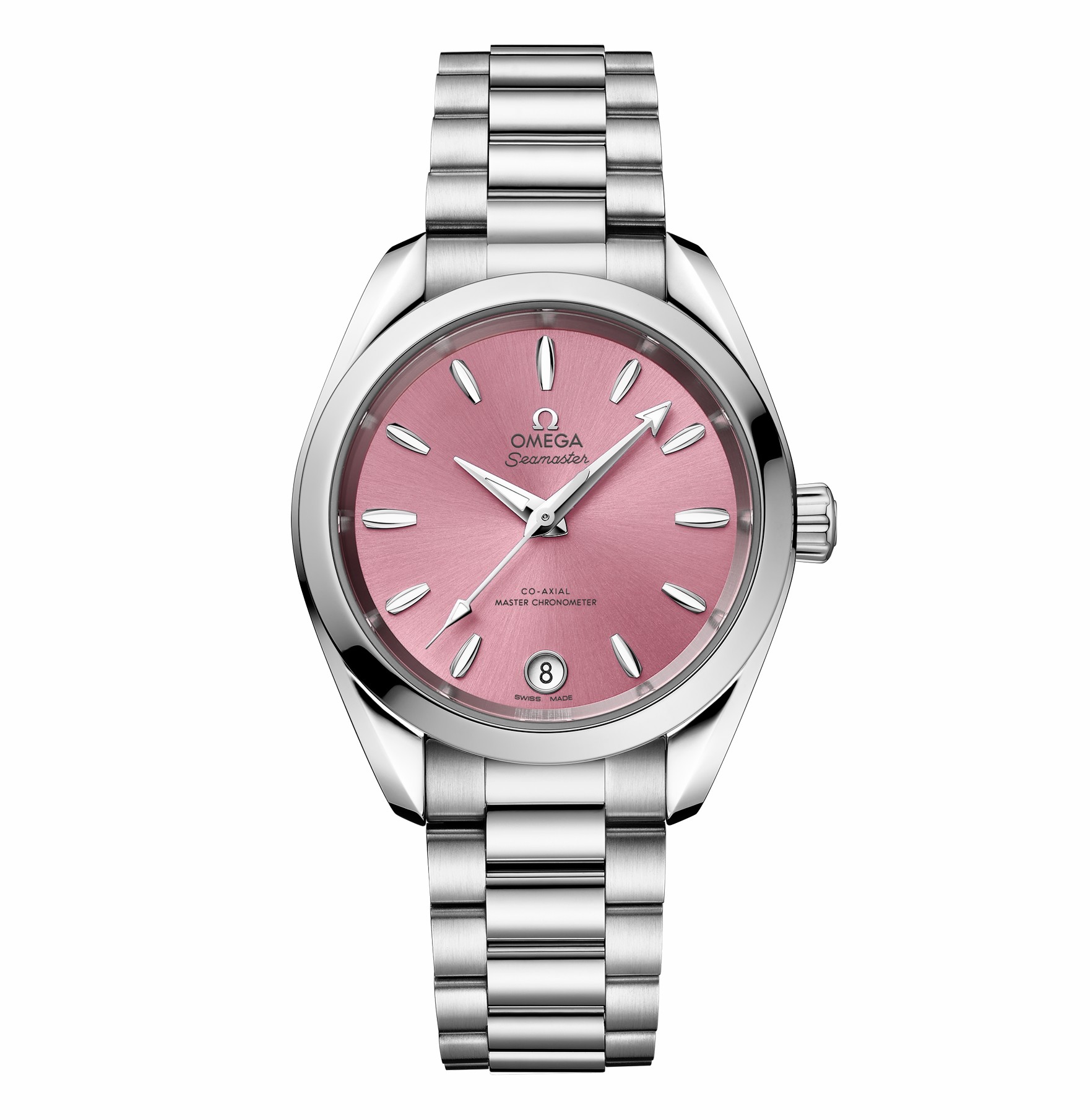 對于女性而言,Aqua Terra 150米34毫米至臻天文臺表或許會更加得心應手一點吧。其整體內外的設計基本延續(xù)了36毫米款的特征,變化主要在于盤面的色彩,如貝殼粉色凸顯出其時尚的柔美,而海藍色表盤則有剛柔并濟的味道,兩者都帶有明顯的婉約色彩,可能頗投女性的眼緣吧。此外,其指針、小時刻度和歐米茄品牌標識均以拋光白色18K金制成,6點位的日歷窗由硬朗的梯形變成可愛的圓形,無疑強化了其女表的色彩。
