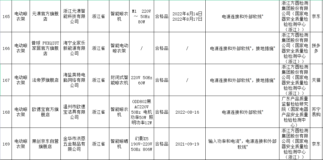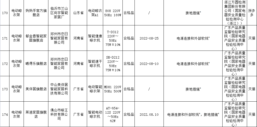 無(wú)獨(dú)有偶,據(jù)上海市市場(chǎng)監(jiān)督管理局發(fā)布的2022年上海市產(chǎn)品質(zhì)量監(jiān)督抽查結(jié)果(第十批)顯示,11批次智能晾衣架抽查不合格,其中涉及HOTATA好太太、美時(shí)美克EMOED、南極人等品牌。